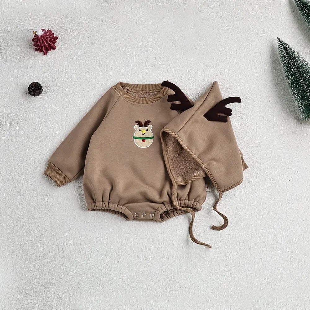 Adorable Embroidered Christmas Romper Jumpers For Baby & Toddler. Coming In Green With An Embroidery Christmas Tree, Red With An Embroidered Santa Clause Or Coffee With An Embroidered Rudolph.